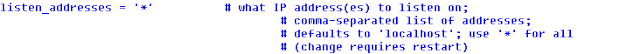 Cari kata listen_addresses kemudian hilangkan tanda pagar pada listen_addresses kemudian ganti localhost menjadi tanda '*' agar database bisa di akses. seperti tampak pada gambar di bawah.